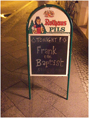 Bands! Here's one way of ensuring you're never short of a place to play: get yourself your own venue. That's probably not the reason Frank The Baptist (the man) quit his former home base in sunny California to become the co-proprietor of this basement bar in windswept East Berlin, but it certainly means that when Frank The Baptist (the band) decided to stage a one-off honky-tonk performance, rearranging the band's usual cinematic anthems into a set of rollicking, piano driven barrelhouse hoedowns, there was no doubt about where the gig should take place. And so it is that the band decants itself into the subterranean confines of the Speakeasy, and squeezes into the tiny performance space behind the bar. The sound engineer peers in through a serving hatch, and the audience crams into any nook and cranny not occupied by musicians or the video crew. Tonight's gig is being recorded for visual posterity, although given that the lighting amounts to a mere three red spotlights and two candles I doubt if the cameras will capture very much. But it's hot and dark and intimate, and even before anyone's struck a note the entire event has a deliciously informal, underground feel, the like of which you just don't get at your local Enormodome. It's