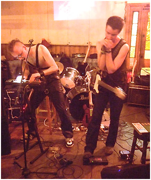 one place old Wob neglected to mention (although I suspect he's been What have we got? Two men, a drum machine, a guitar and some fetishistic body straps - all the essential ingredients, then. The band sets up a fearsome churn and grind, a sonic soup of beats, electronics and effect-o-rama guitar in which, if you listen closely with a certain suspension of disbelief, it's possible to discern the mangled remains of Proper Songs. There's even a drum machine solo - a rat-tat-tat of fingers on the trigger buttons which certainly gives the speaker cones in the PA a good workout. Perhaps the best bit of the N, N Minus set is the interlude where the be-strapped member of the duo takes it upon himself to sing to us via a microphone plugged into the guitar effects unit. You've heard of human beat boxes? Meet the human guitar solo. Sometimes, it's hard to shake the suspicion that N, N Minus are being weird for the sake of being weird, but they have a certain mutant-pop charm that carries the show. There