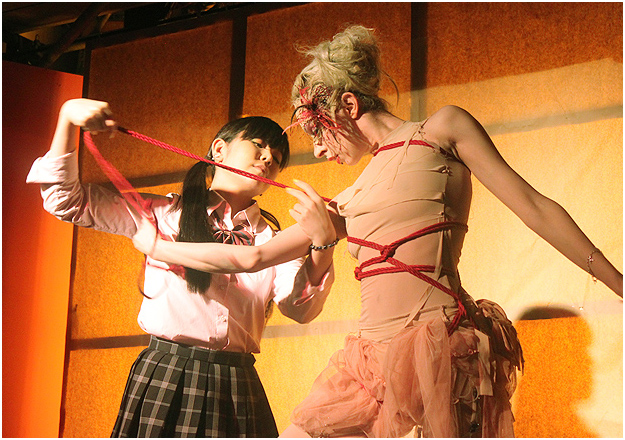 She executes attitudes and arabesques across the floor...before being tied up by a Japanese schoolgirl, whose benevolent calm seems downright surreal as she works the knots.