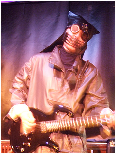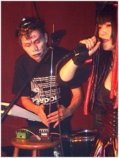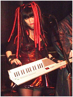 to London, and they're still 160 I'm sure this odd situation is not because Psydoll don't want to play London. I dare say they'd jump at the chance to play anywhere. It's simply that the band, based as they are in Japan, have limited UK contacts and little in the way of information about likely promoters, venues, and gig opportunities that might exist daaahn saaarf. Meanwhile, promoters and venues who might be up for a Psydoll show know nothing about the band. Result: a distinct gap in the tour itinerary. It's not a unique problem, and not an insoluble problem, either. A little promotion lotion could quite easily grease the wheels. But without that essential communication in place, getting a foot in the door isn't easy. And that is the reason we've come to Stoke On Trent. Because if Psydoll can't come down here, we'll just have to go up there. So, here we are, in the stripped-out surroundings of the Glebe. Bare floorboards and a big PA - the essential ingredients of a no-shit gig venue. There is a low stage, and on that stage we find three Psydolls: Nekoi on vocals and portable keyboard, Ucci, who touts a guitar and a goggles 'n' mask outfit like a trans-dimensional motorcyclist, and Loveless on drum (yep, just the one), theremin and assorted electronics. Not, then your usual rock 'n' roll band, but that is the beauty and genius and appeal of Psydoll - an appeal which I sometimes wonder if the band themselves are really aware of. They're so delightfully, gloriously, weird. Psydoll don't just rip up the rule book. It never occurred to them that there was a rule book in the first place. Their ideas beam directly from their brains to their instruments with barely a tip of the hat to the rest of the musical world. And yet, while Psydoll certainly kick up an exhilaratingly raucous racket, in their own strange way they're at home to Mister Pop Song, too. One minute they're knocking you flat with a sonic bulldozer, and the next minute they've surprised you with a lilting tune you can whistle. Sometimes, they do all this in one song, and make it all seem natural and unforced even as they effortlessy pull shapes from the air and tunes from the technology.